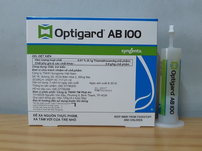• Bả diệt kiến Optigard AB100 được đóng gói rất dễ dàng để sử dụng, chứa 0.01% hoạt chất, có cấu trúc dạng gel đóng gói với dạng bơm tiêm 30g.